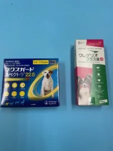 画像左側のお薬は、本格的に出るのは今年のシーズンからなのですが、「ネクスガード スペクトラ」という、ノミとマダニとフィラリアが一度に予防できるお肉タイプの飲み薬です。フィラリア予防にはオフシーズンがありますので、こちらのお薬の他にフィラリア予防成分が入っておらず、ノミとマダニのみ予防できる「ネクスガード」というシリーズがあります。これで一年中ノミ・マダニ・フィラリアが予防できます。(注2・ 画像右側はクレデリオプラスといって、こちらもまたノミ・マダニ・フィラリアその他を一度に予防できるオールインワンのお薬です。今後もこのようなバリエーションが増えていく傾向にあります。)