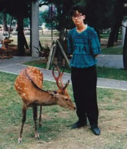 写真左は奈良公園での鹿とのツーショットですね。反抗期真っ盛りで鹿と写真撮るなんて恥ずかしいやんけ!早くしろよ的なオーラがビンビンですね。写真中と右は私の青春時代そのもの、バンド活動での様子です。まあよく遊び、全く勉強しなかったですねー。だからこそ附属高校なのに指定校推薦からもれるという一大事になってしまうわけです。そして2年にも及ぶ浪人生活が始まるわけですね。でも、一から大学受験をしなければならないとなったときに、本当にやりたいこと、なりたい職業をよく考えて今の自分がありますので、青春を謳歌したのも良かったのかな、と思っています(両親にはメチャクチャ迷惑かけましたが)。