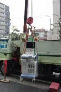 思い起こせば、2009年の5月。次々と新品の医療器械がどんどん搬入されて、あの時も興奮のるつぼだったなあ。出会いがあれば別れがあるように、8年間苦楽を共にした初代エコーが引き取られて行く時が来ました。8年前、初代エコーが納品された時も嬉しくて抱いて寝たかった記憶がよみがえってきます。納品の時はすごく大事そうに運ばれていくのに、引き取られて行く時は画像右のように、なんとなく無造作にクレーンで引き上げられて行きました。私も詳しくは解りませんが、リース品の医療機器は法律的にまだ使えるものでも産業廃棄物として処理しなくてはならないそうな。
