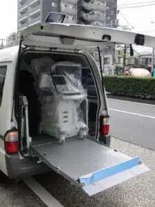 思い起こせば、2009年の5月。次々と新品の医療器械がどんどん搬入されて、あの時も興奮のるつぼだったなあ。出会いがあれば別れがあるように、8年間苦楽を共にした初代エコーが引き取られて行く時が来ました。8年前、初代エコーが納品された時も嬉しくて抱いて寝たかった記憶がよみがえってきます。納品の時はすごく大事そうに運ばれていくのに、引き取られて行く時は画像右のように、なんとなく無造作にクレーンで引き上げられて行きました。私も詳しくは解りませんが、リース品の医療機器は法律的にまだ使えるものでも産業廃棄物として処理しなくてはならないそうな。